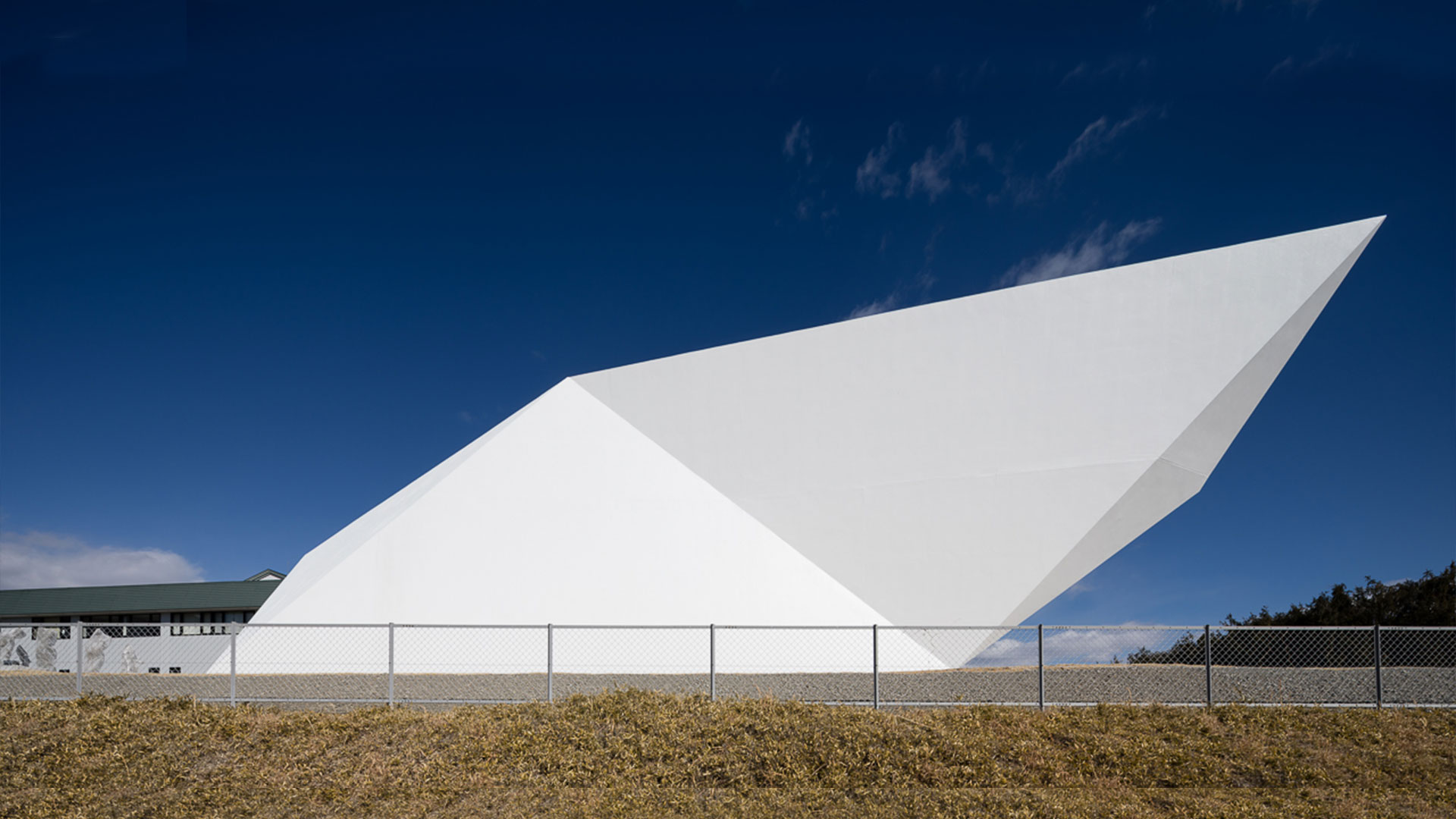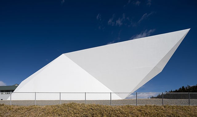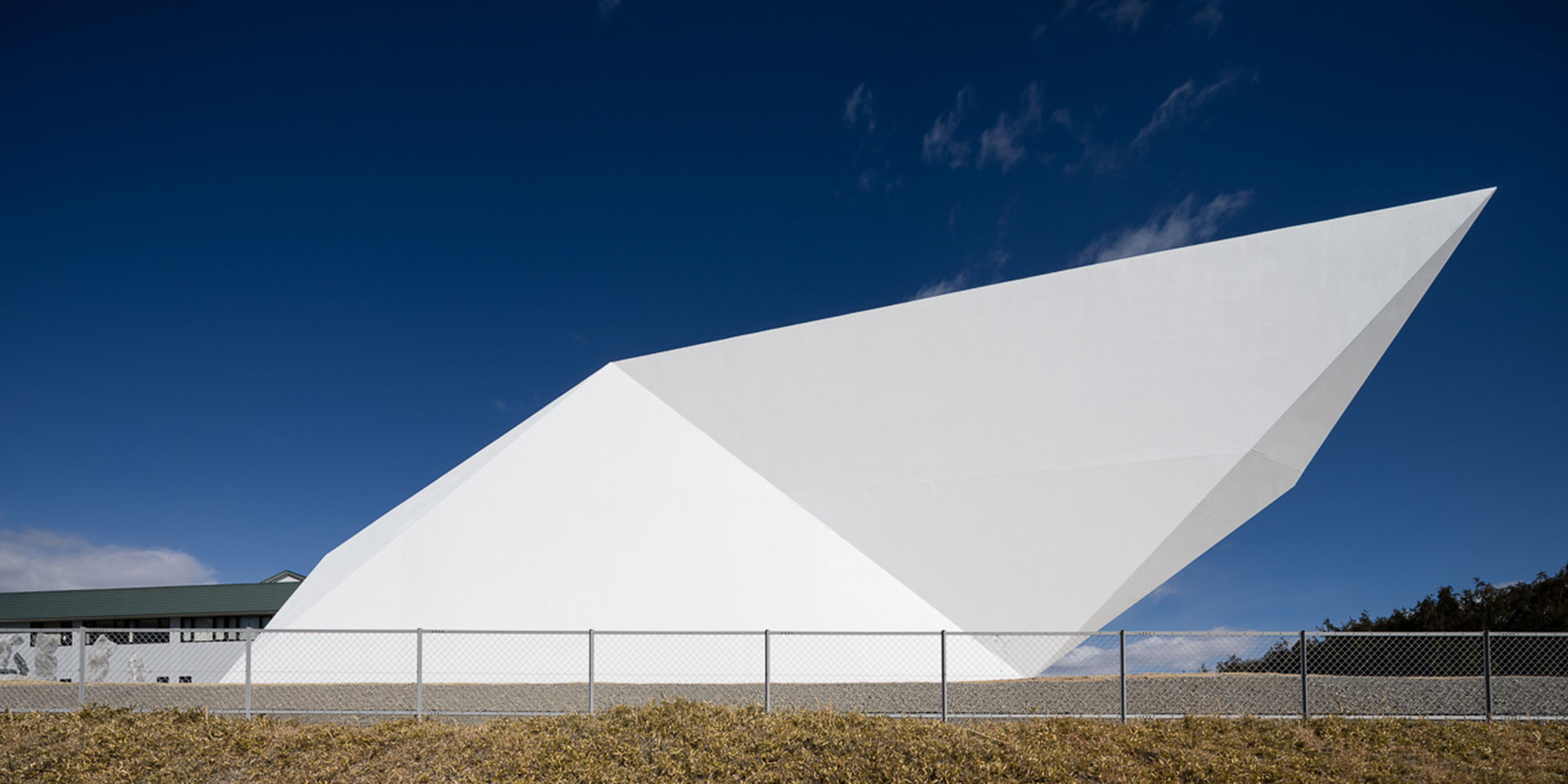 雪化粧をした山々のような白いフォルムが特徴の体験館では、アルプスの雄大な自然を眺望しながら