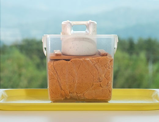 袋の中に種水※を入れて輪ゴムでしばり、こねて混ぜ合わせます。その後、輪ゴムを外して袋の中の空気を抜き容器に袋ごと入れて、再度輪ゴムでしばります。木ぶたと重石を乗せたらできあがり!